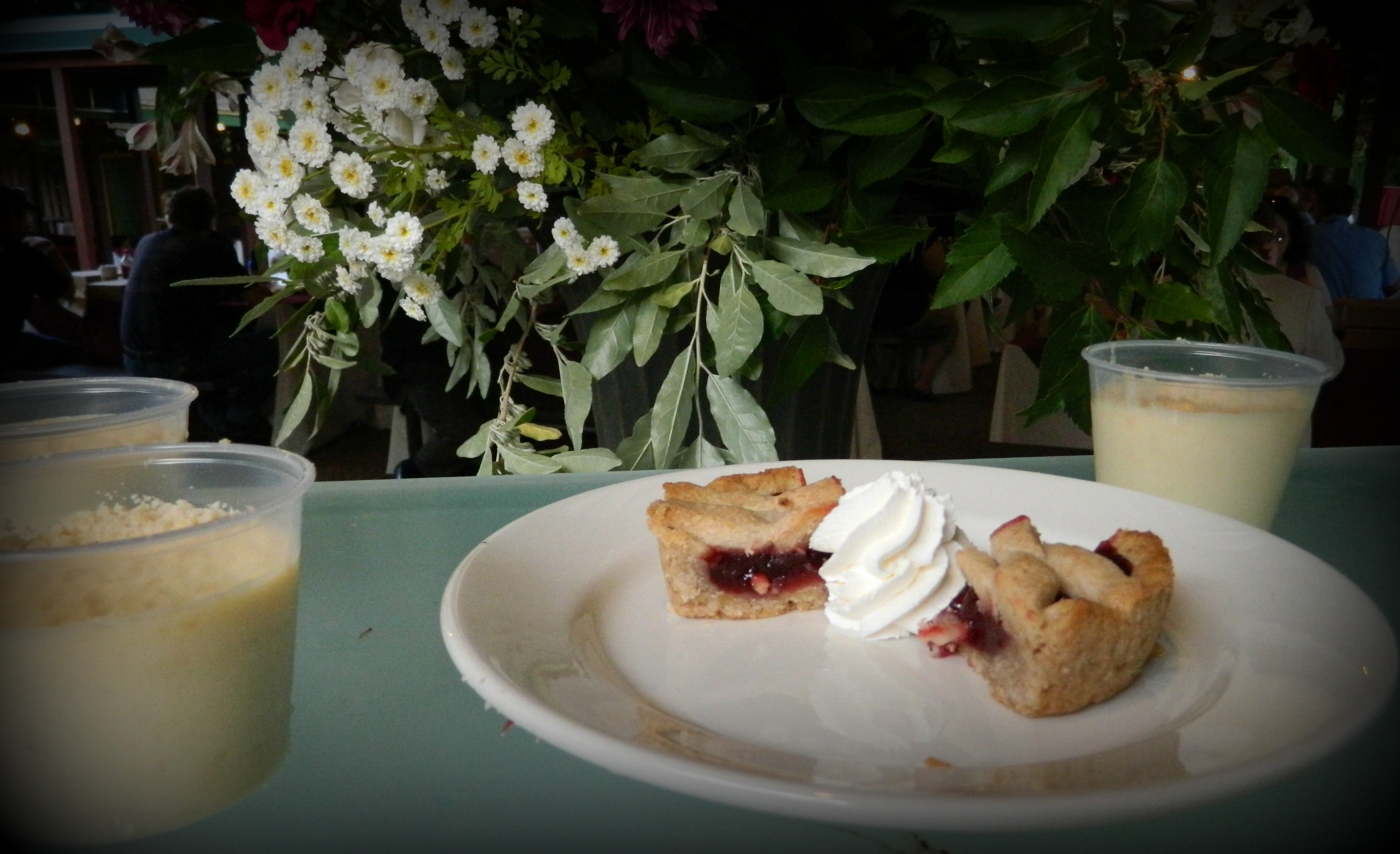 The cups are Hazelnut Custard – Spanish flan custard with ground hazelnuts. On the plate is the Austrian Linzer Torte.