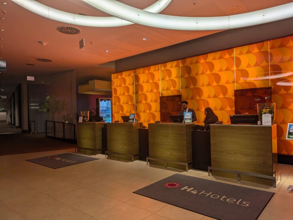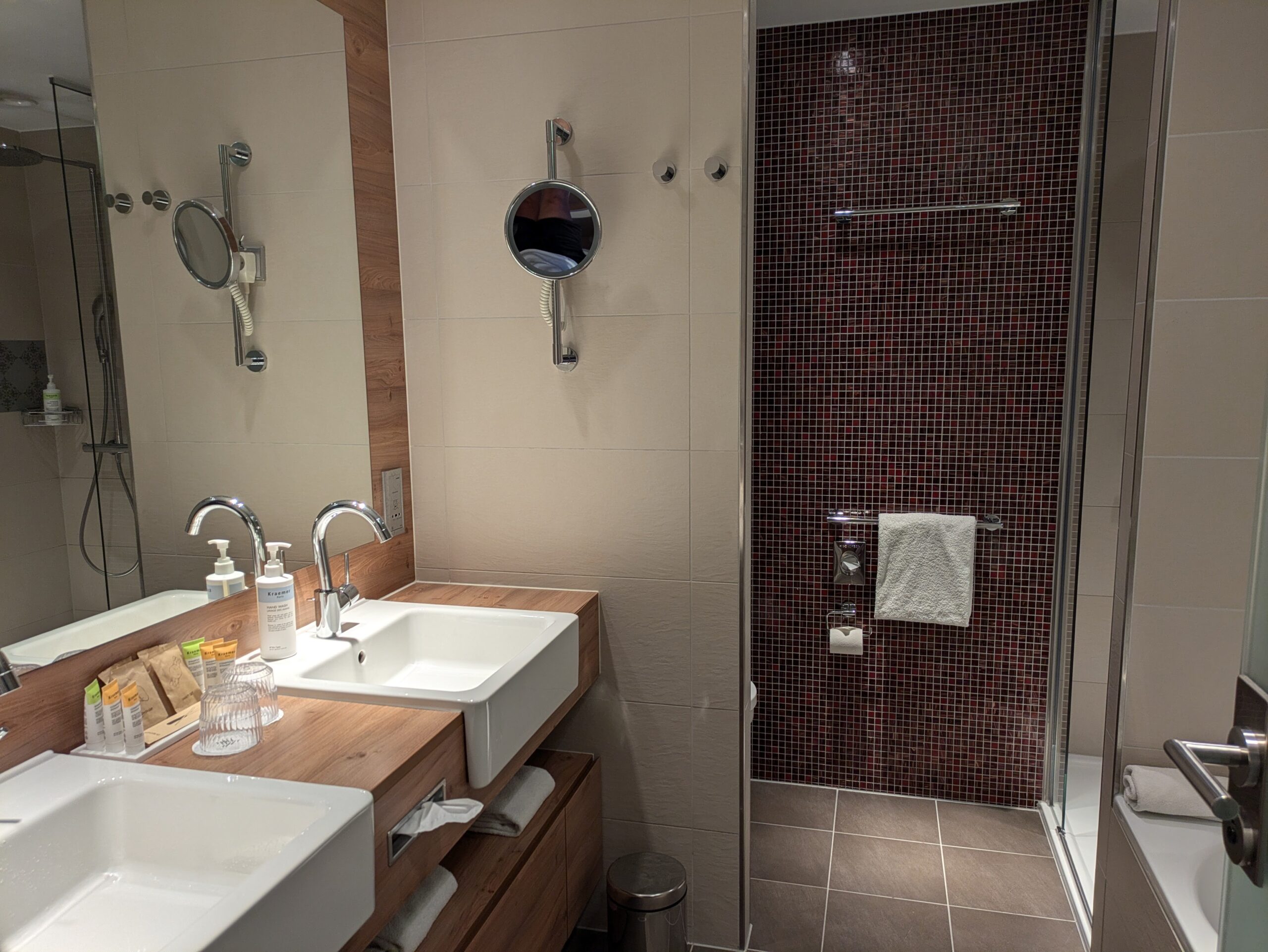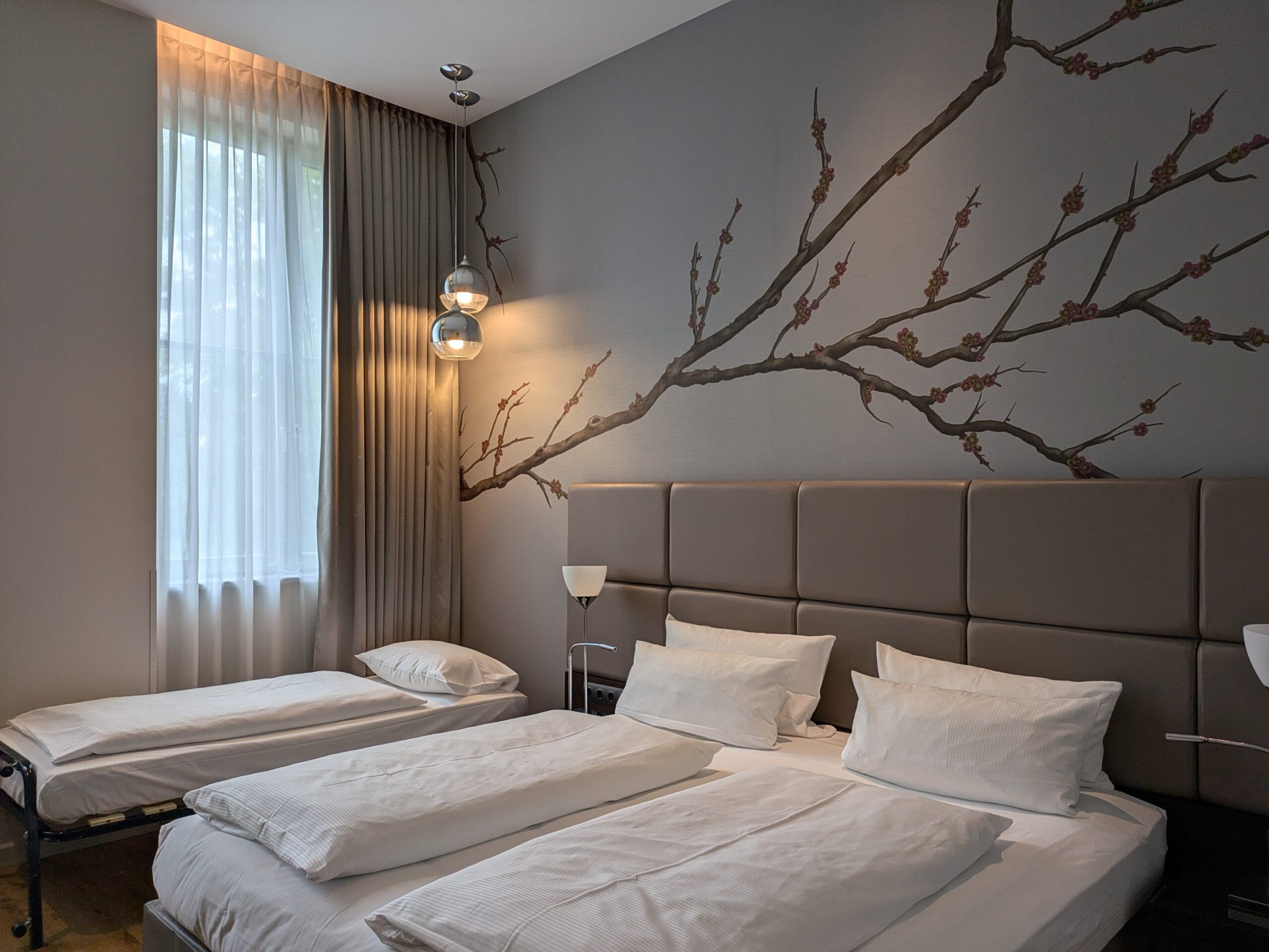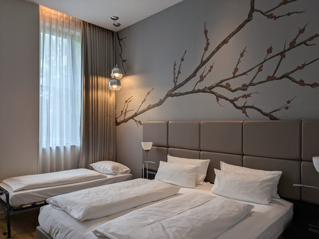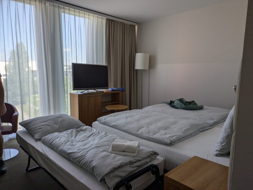 Our room at the H4 Hotel Munich Messe was comfortable and welcoming with an elegant bathroom. Like other German hotels on this tour, the larger bed was a set of twin beds pushed together. I loved that each person has their own blanket (rather than one large blanket covering the whole bed). I’m not sure if that’s a European thing or a German thing, but I approve. The third bed was a cot; I was told that it was comfortable.