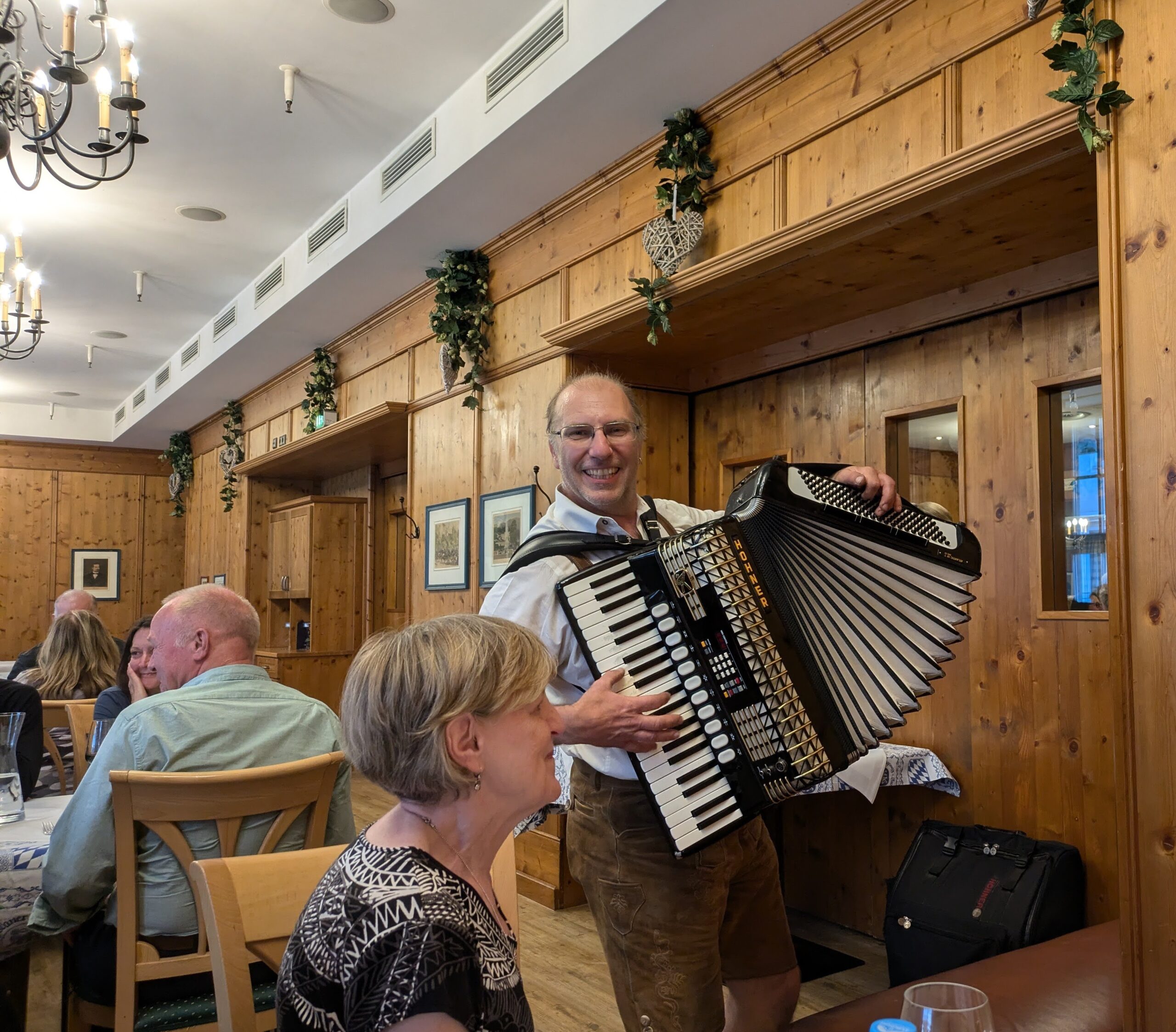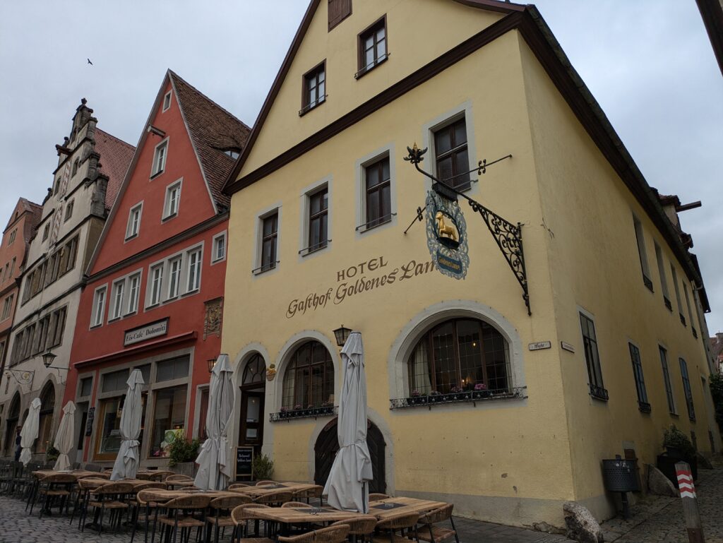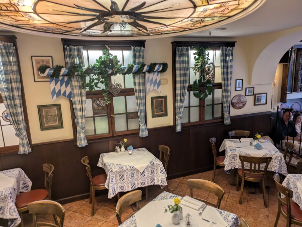 The Goldenes Lamm (Golden Lamb) was the dining part of the optional Night Watchman tour. Dinner included a pork dish, spaetzle and apple strudel. Dinners with Globus usually include two beverages. We chose red wine, light beer (there’s a choice of light or dark beer) and an aperol spritz.