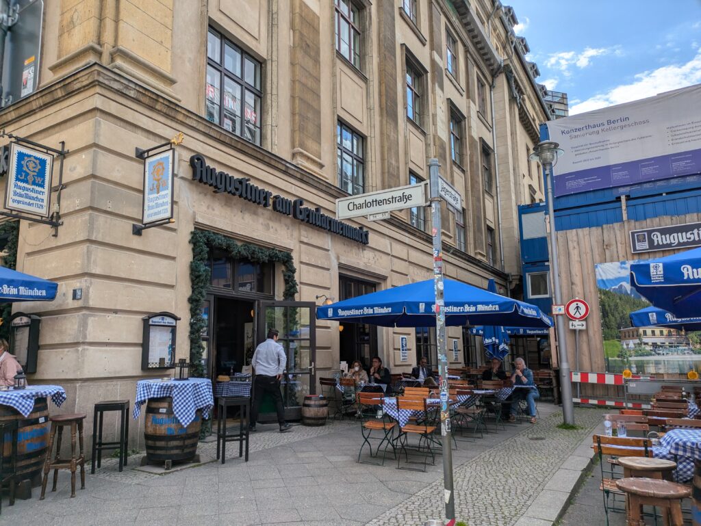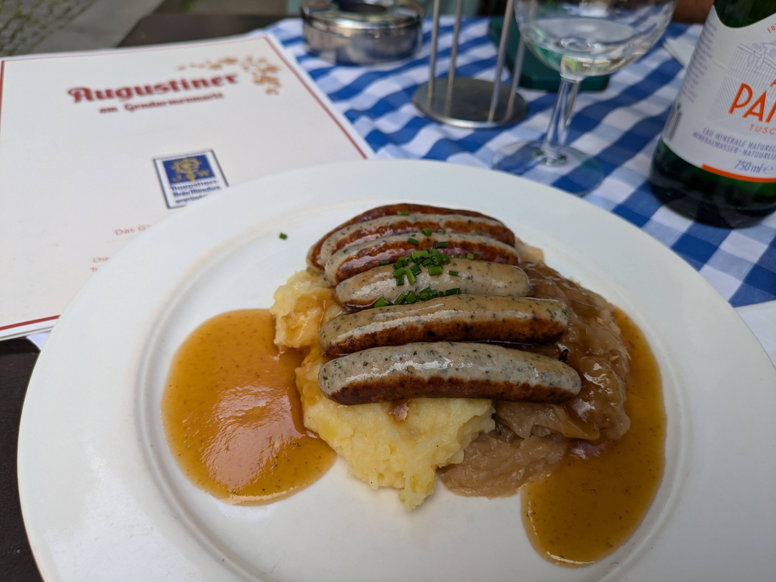 Augustiner am Gendarmenmarkt, near the French and German Cathedrals, was a fun and casual meal at the outdoor biergarten. We had currywurst with mashed potatoes, weisswurst (a white sausage in broth) and goulash with spaetzle.