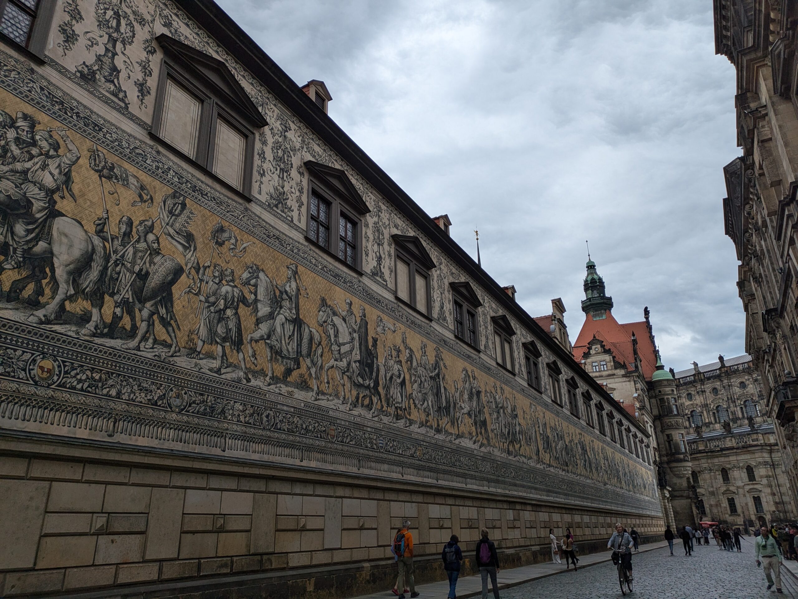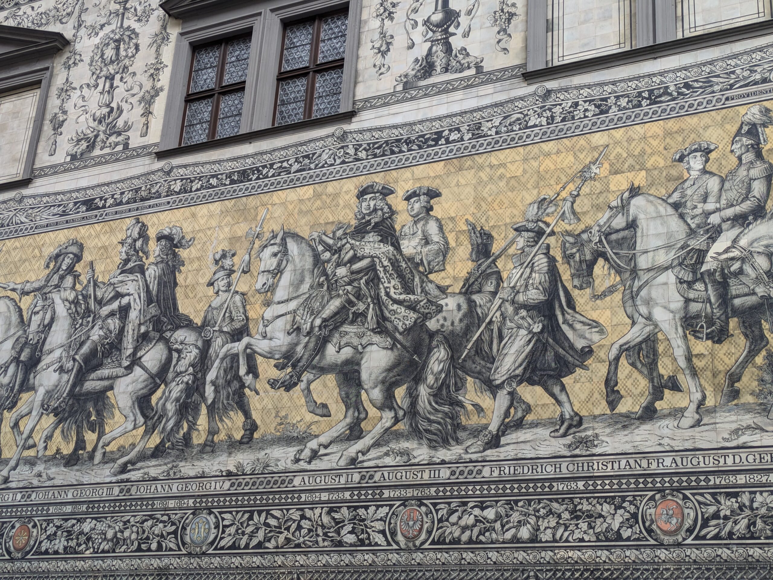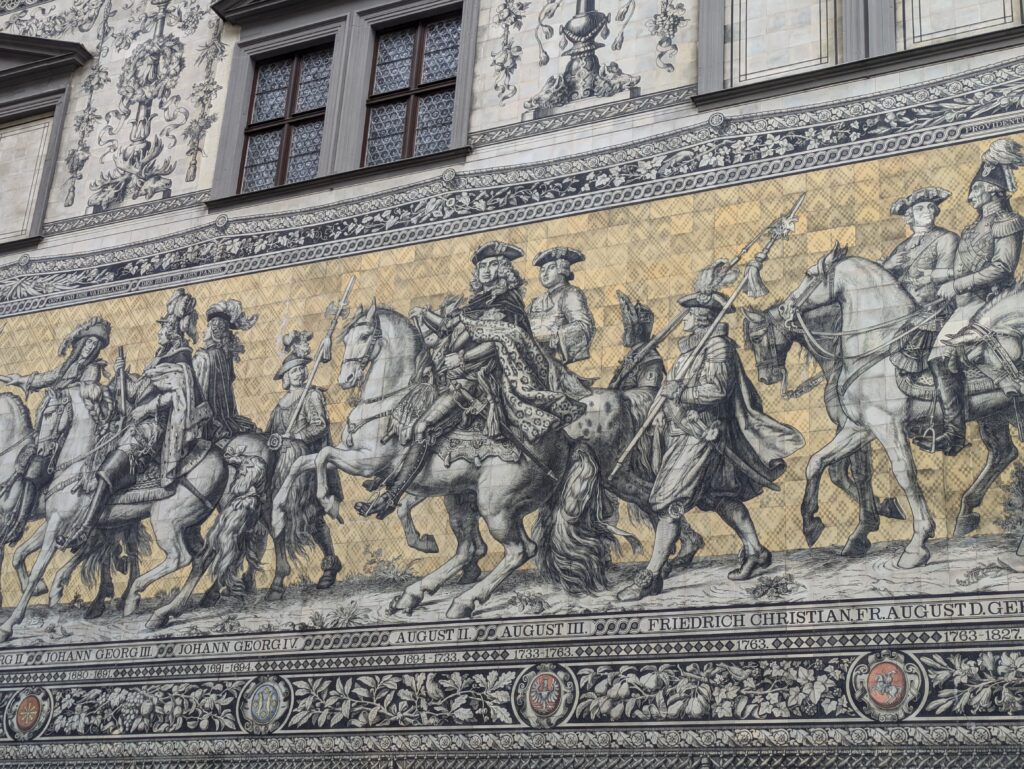 The Furstenzug (Procession of Princes) mural is easily one of the most spectacular attractions in Dresden. It’s made from thousands of pieces of Meissen porcelain (a luxurious product in this region of Germany). Depicting the 34 rulers of Saxony throughout the years, it’s about 394 feet long and located on the outside wall of the Stallhof.
