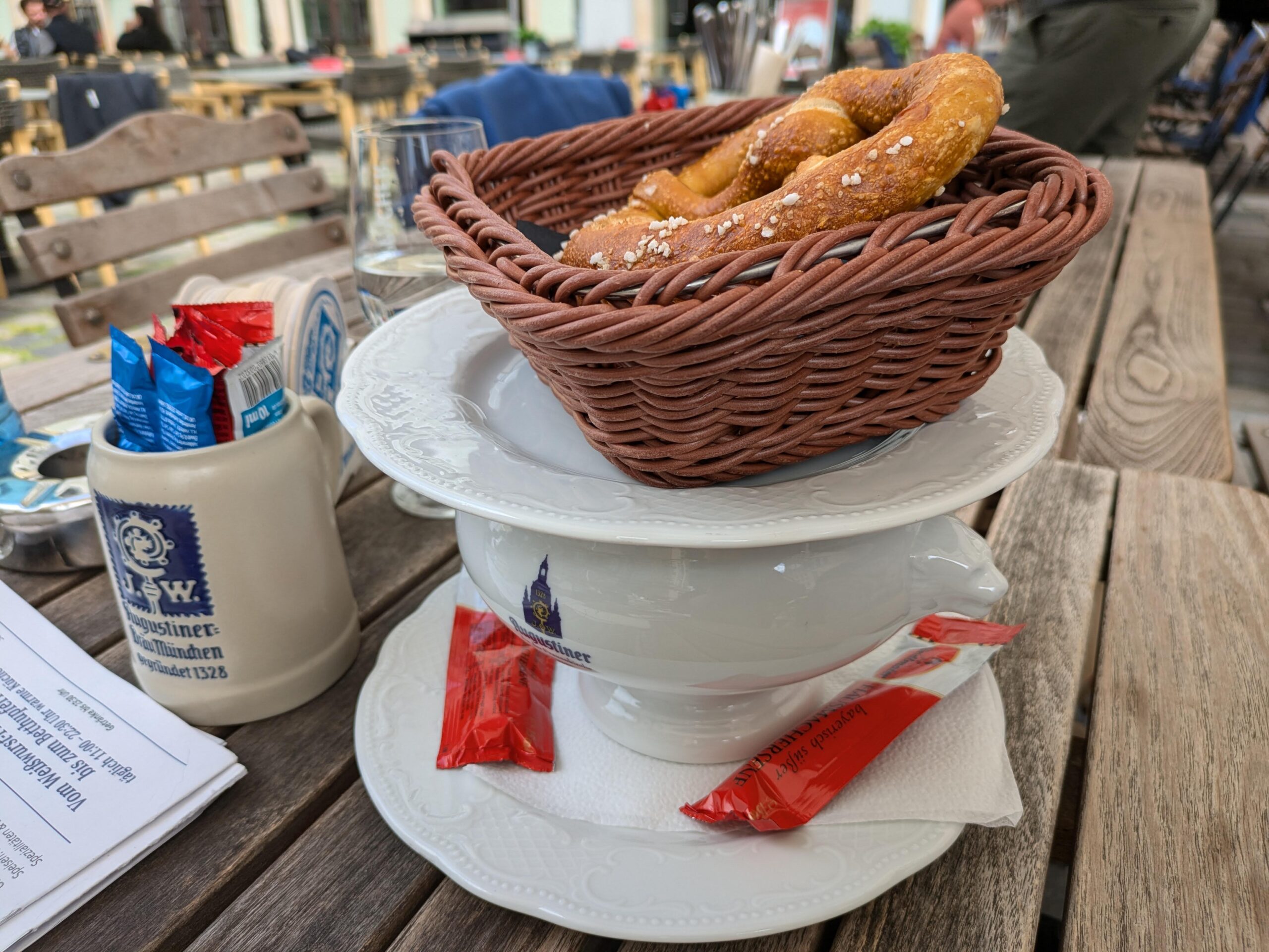 Augustiner an der Frauenkirche is another relaxing patio dining experience. We had a pretzel, Saxon potato soup and weisswurst for lunch.