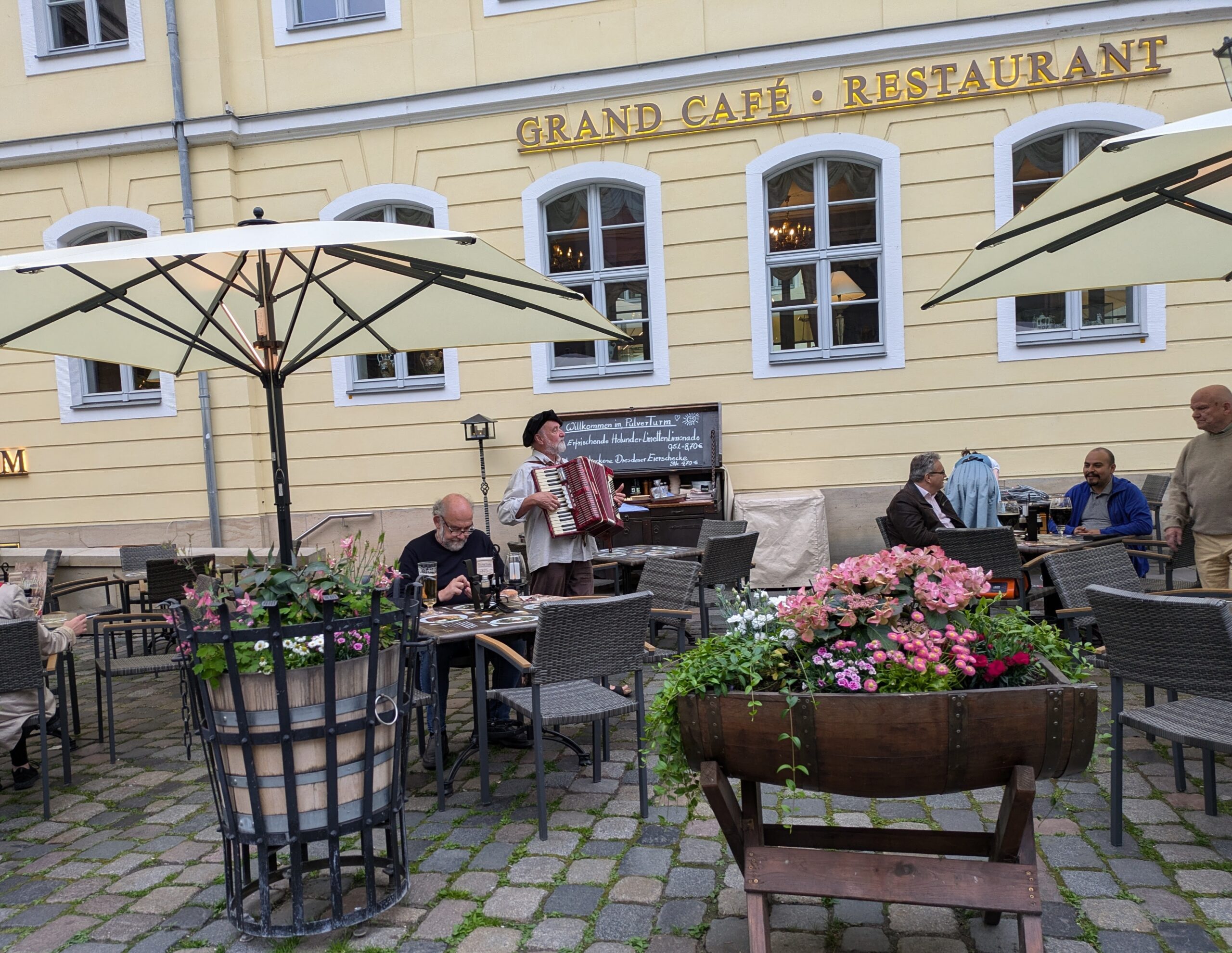 With a beautiful Baroque setting, the historic Coselpalais Grand Café and Restaurant is near the Frauenkirche. It’s built on a former windmill that was used for military storage. Originally built as a residence in 1765, it’s named for Countess von Cosel, a mistress of Augustus the Strong. It was severely damaged during WWII and reconstructed around 1999. We had Saxon-style beef with red cabbage and raisin sauce, a potato dumpling, schweinsteak au four, asparagus and strawberry salad and a refreshing Aperol spritz.