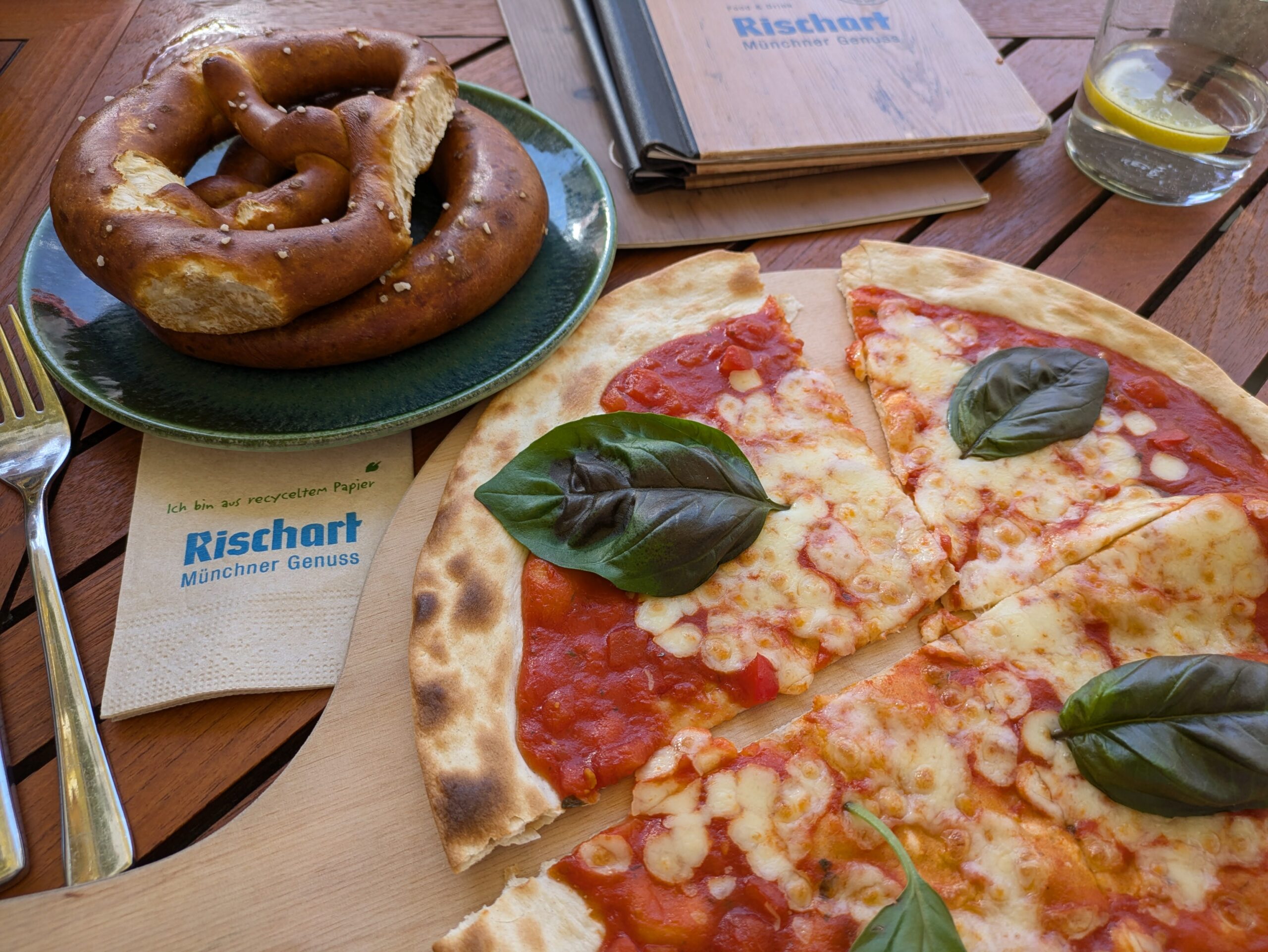 Rischart Café, in Marienplatz Square, is a fun and lively open-air dining area. It was a terrific people-watching spot, especially with all the soccer fans milling about. We had pizza, a pretzel and yet more weisswurst.