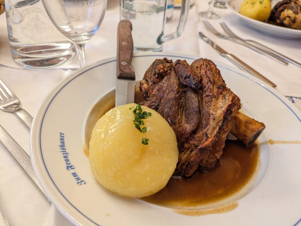 Zum Franziskaner (At the Franciscan) was our last Globus dinner with the whole group. This was another delicious and lively experience (and, yes, more accordions). Enjoy a big basket of brot (bread) and menu choices like sliced chicken breast with mushroom sauce, spaetzle, roast pork with gravy and a potato dumpling. Franziskaner weiss bier (wheat beer) was the beverage of choice here. For dessert, I chose the stewed plum compote with sorbet.